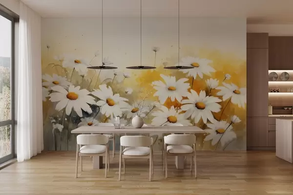 Wall murals A field of white daisies with yellow centers, against a soft yellow and beige background, watercolor style Nr. w09218