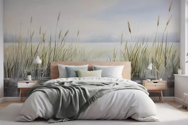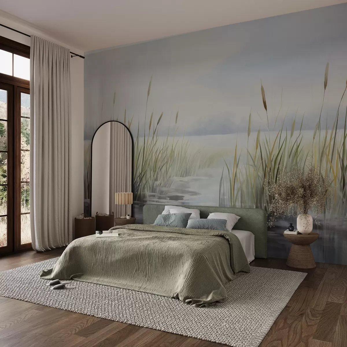 Wall murals A watercolor textured painting imitation of landscape with lake, grass, overcast sky and blurred background Nr. w09219
