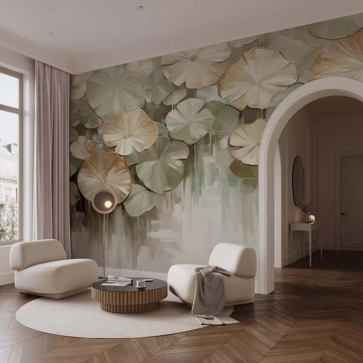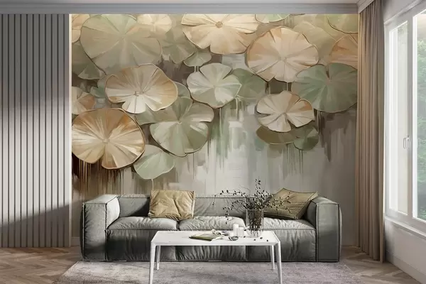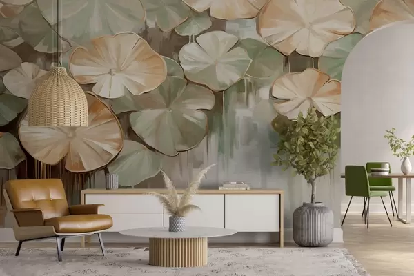 Wall murals Textured lily pads with green and beige colors in a pond, the background is a blurry mix of white, green and brown Nr. w09255