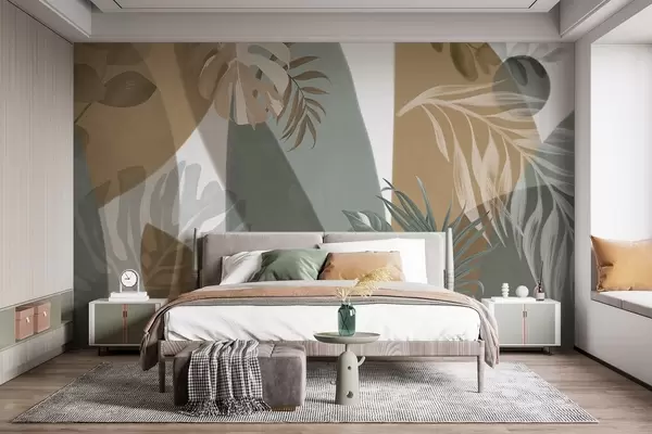 Wall murals Monstera leaves and palm leaves in a pattern with brown, white and green colors, tropical vibe, abstract shapes, decorative Nr. w09288