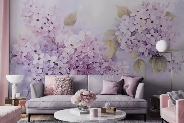 Wall murals Lilac textured flowers with light purple petals, light green leaves, watercolor style, soft, pastel colors, delicate brushstrokes Nr. w09291
