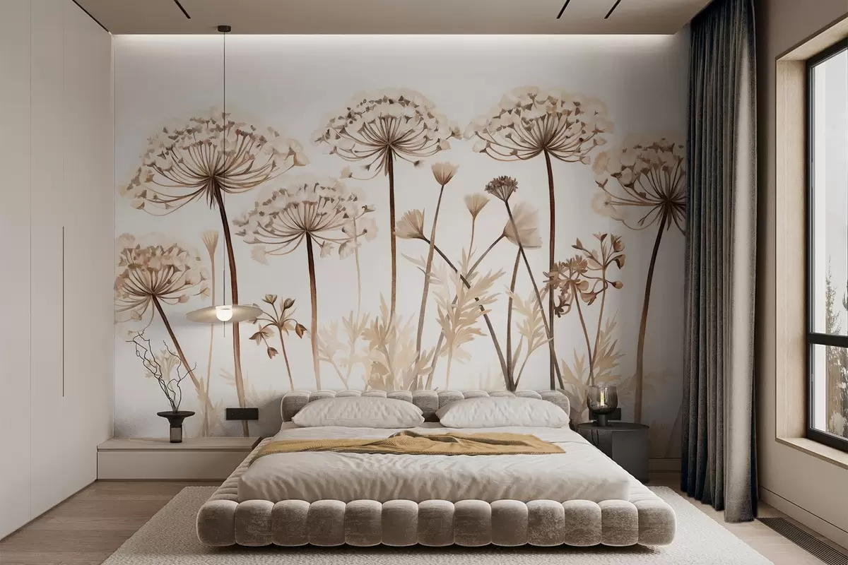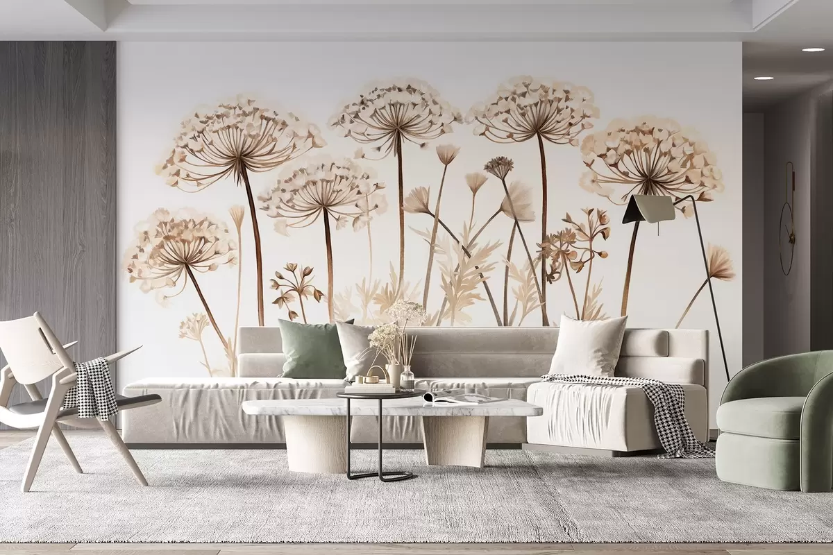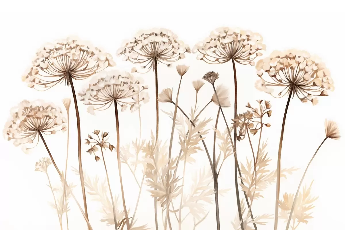 Wall murals Queen Anne's Lace flowers in a field, textured painting imitation, brown, beige and white color palette, botanical illustration Nr. w09294