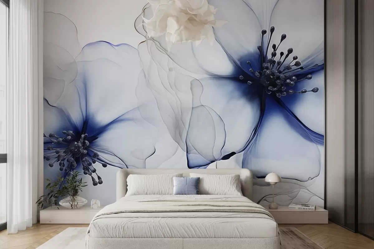 Wall murals Two translucent textured blue flowers with visible stamens, overlapping delicate petals, and a soft flowing texture Nr. w09295v1