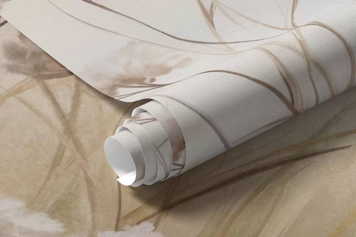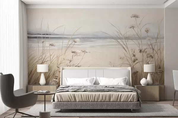 Wall murals A field of wheat with white flowers in the foreground, a beach and the ocean in the background, neutral pastel muted colors Nr. w09298