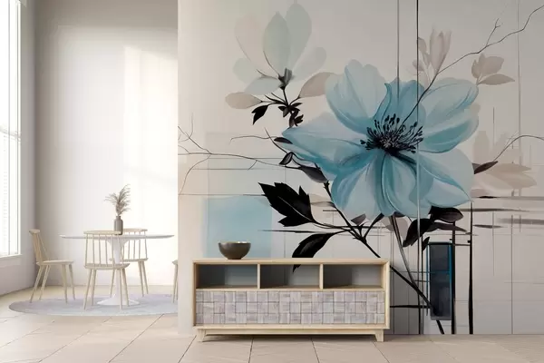 Wall murals Abstract textured blue flower with dark leaves and branches, geometric minimalistic shapes and lines in muted colors Nr. w09332