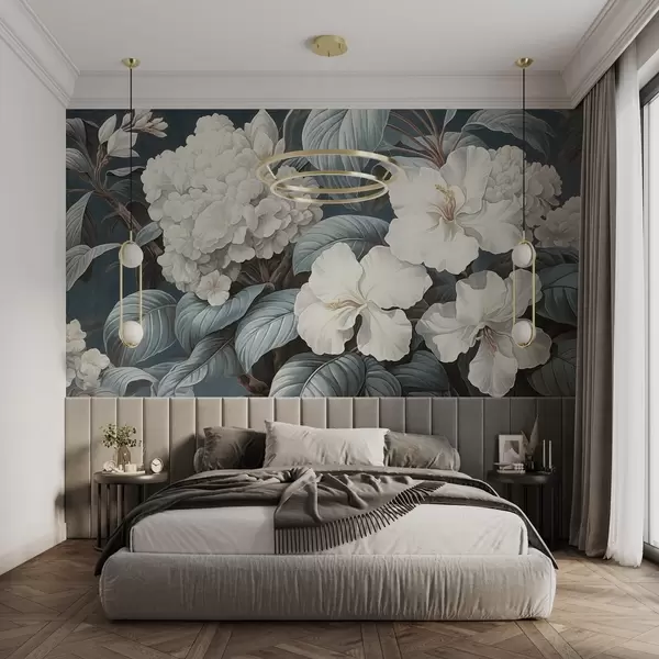 Wall murals White tropical flowers with delicate petals and leaves in a dark blue background, vintage textured style, botanical illustration Nr. w09334