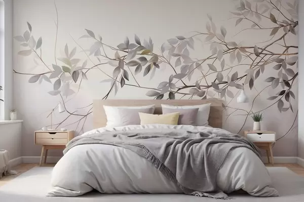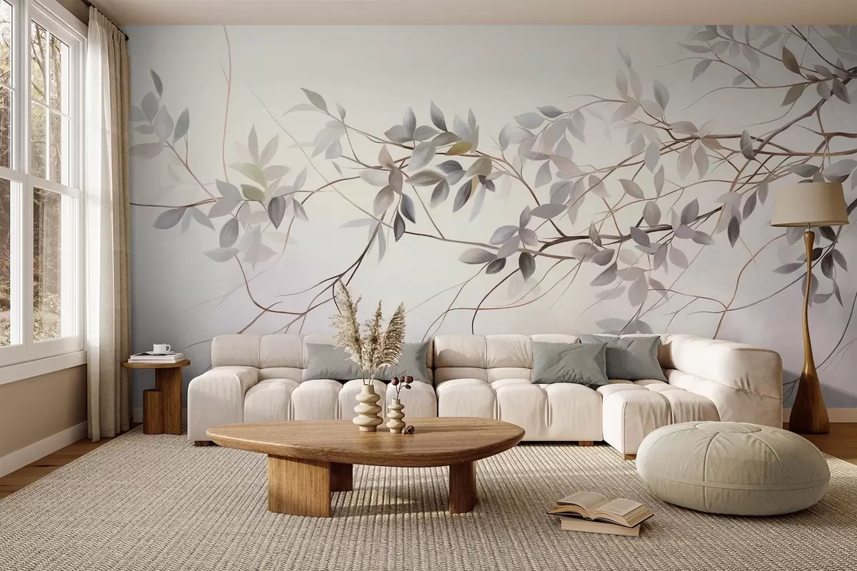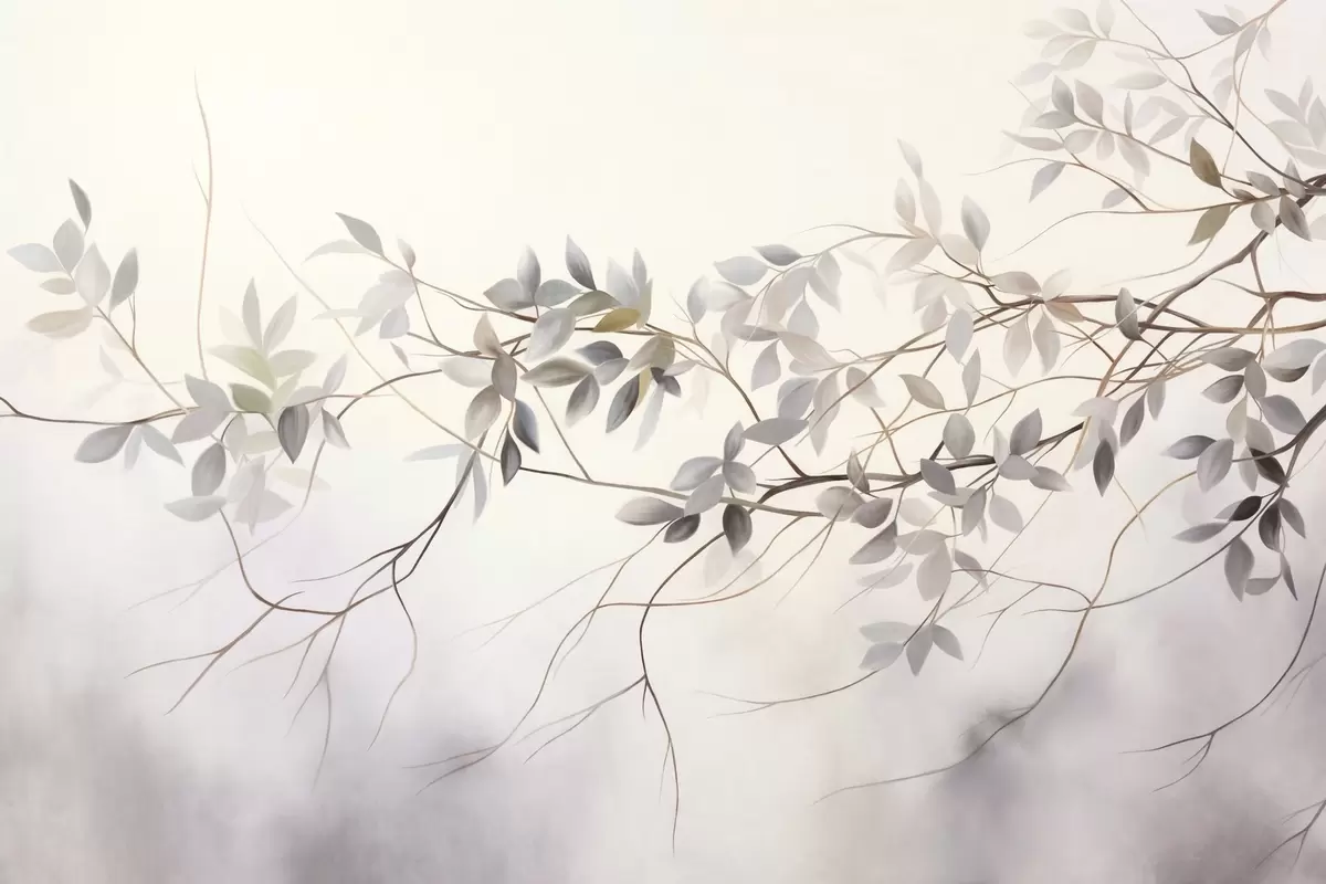 Wall murals Delicate textured branches with muted grey, purple and green leaves against a soft, blurred background Nr. w09336