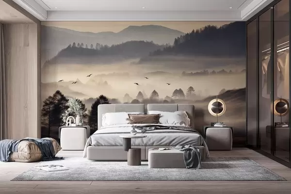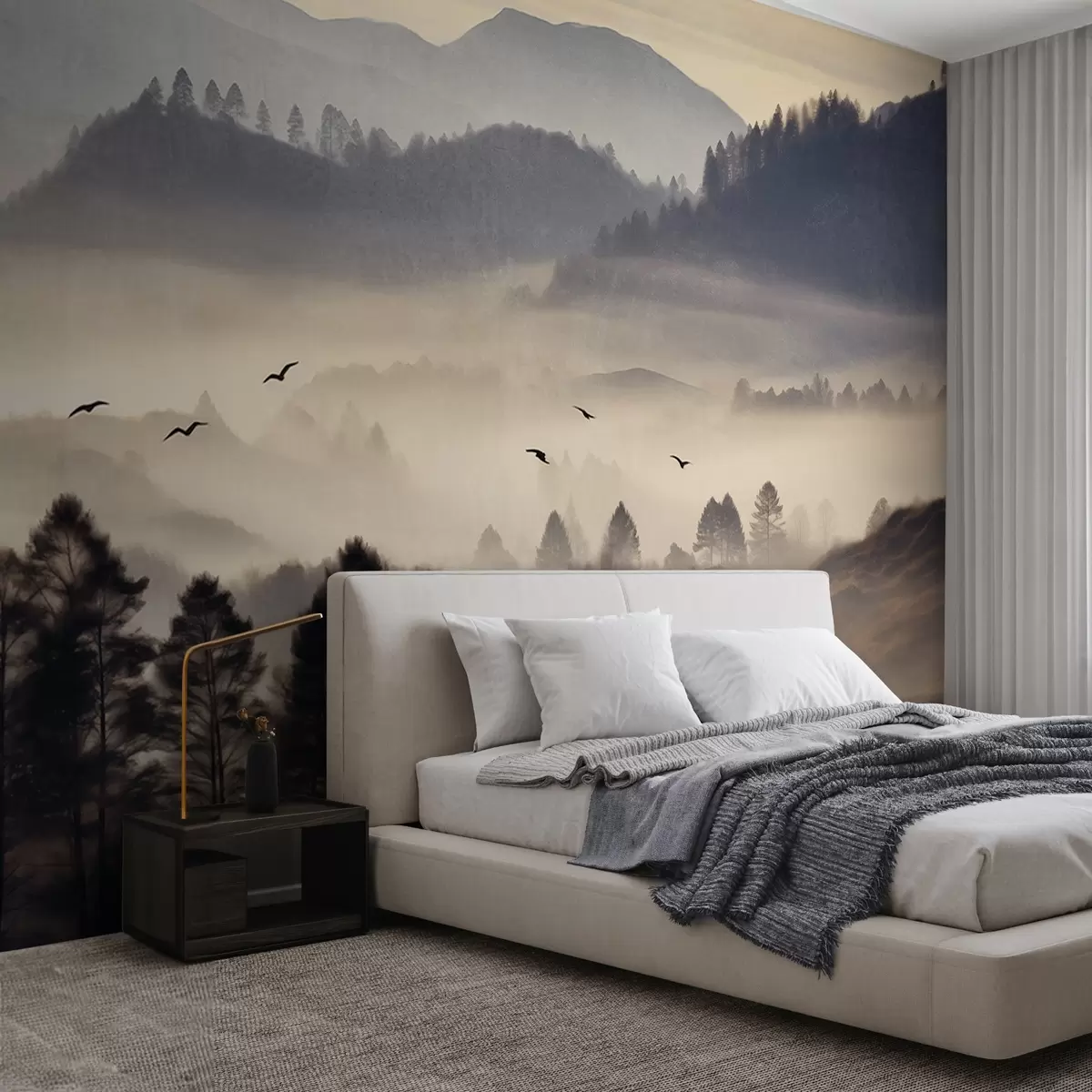 Wall murals Textured mountain landscape with layers of fog, silhouetted trees in the foreground, distant mountain range, soft lighting Nr. w09338