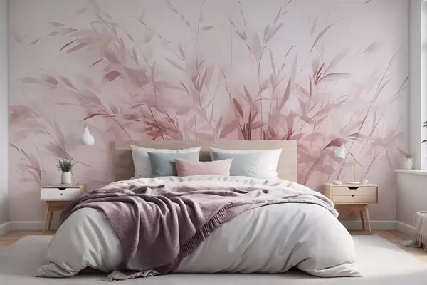 Wall murals Grass and weeds with thin leaves and stems, light pink colors, soft and delicate brushstrokes, minimalist print Nr. w09342v2