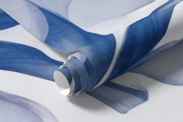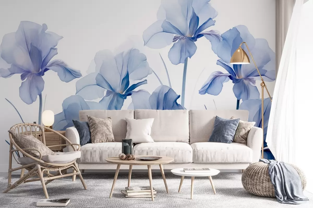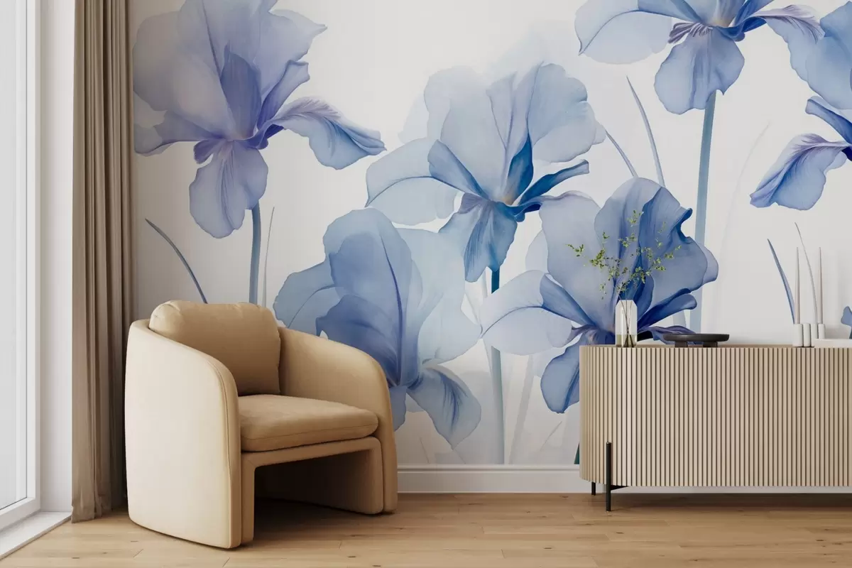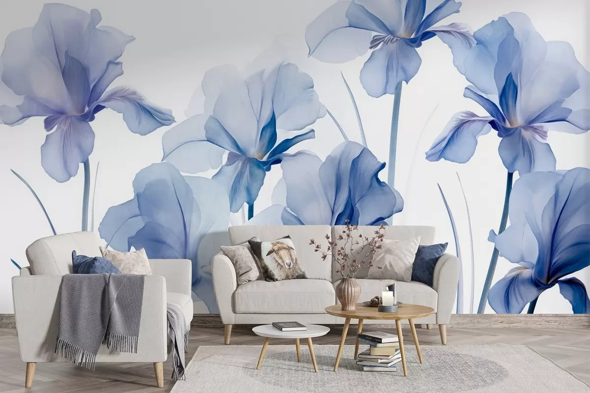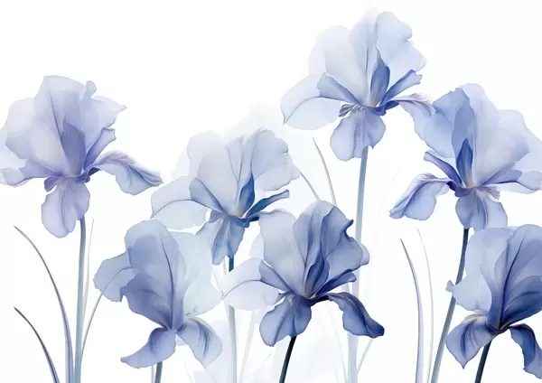Wall murals Blue iris flowers with translucent petals and long stems, arranged in a row against a blue background, soft and textured Nr. w09379