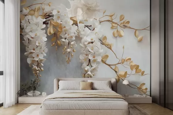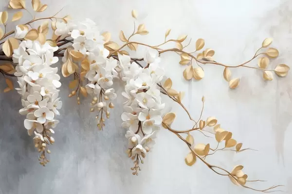 Wall murals White wisteria flowers with yellow leaves on a branch, cascading down against a textured white background, delicate petals Nr. w09381