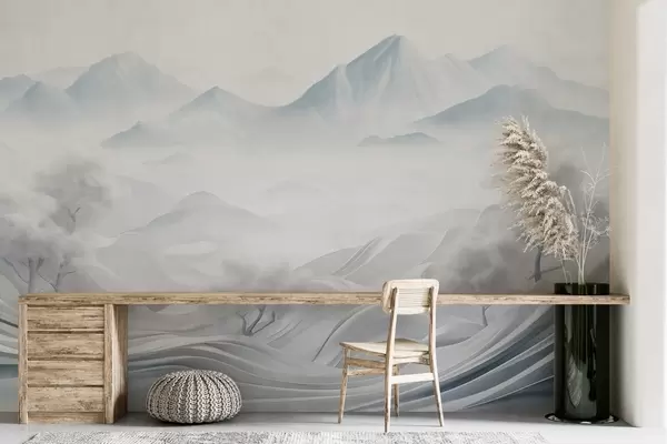 Wall murals Snowy abstract decorative mountain landscape with white trees and fog, minimalist textured style Nr. w09426