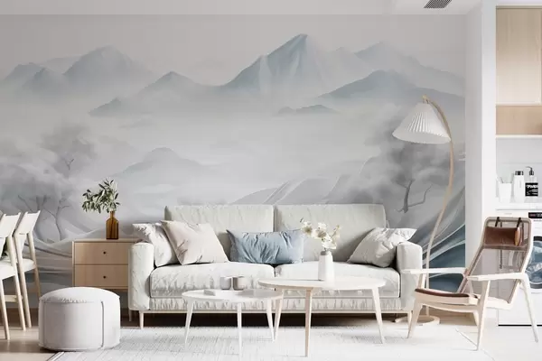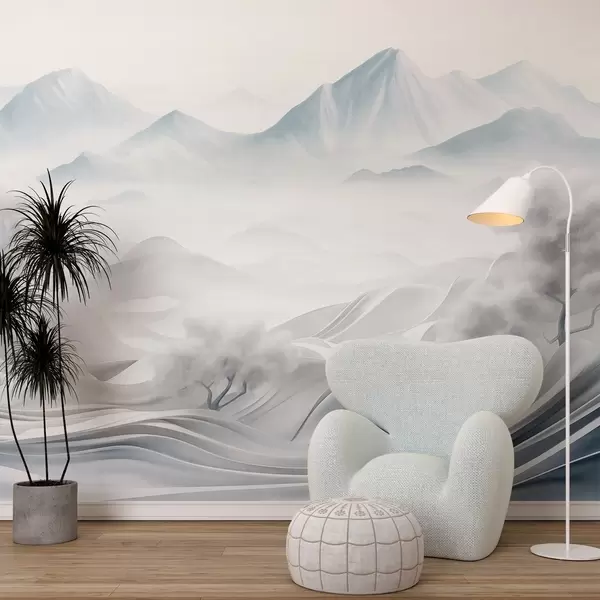 Wall murals Snowy abstract decorative mountain landscape with white trees and fog, minimalist textured style Nr. w09426