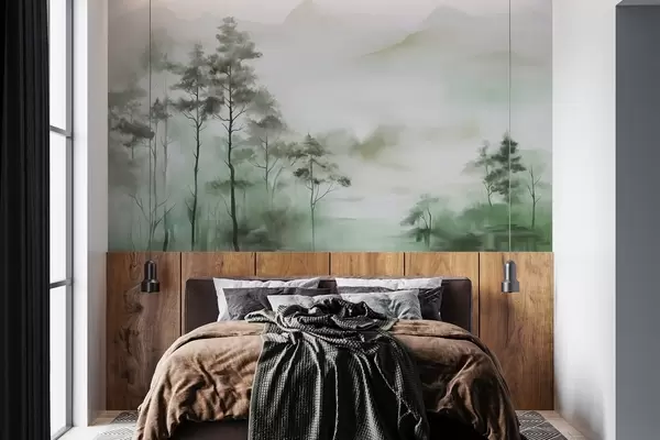 Wall murals Foggy landscape with tall trees and mountains muted green and gray tones, minimalist style, textured Nr. w09469