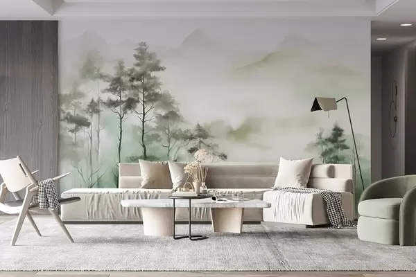 Wall murals Foggy landscape with tall trees and mountains muted green and gray tones, minimalist style, textured Nr. w09469