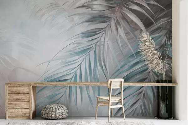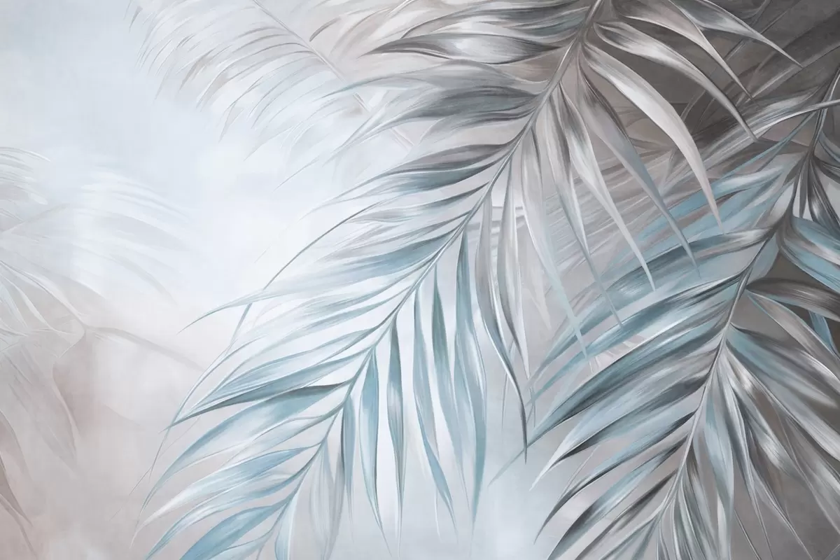 Wall murals Palm leaves with gray and blue tones, light textured background with soft colors, elegant tropical style Nr. w09475v1