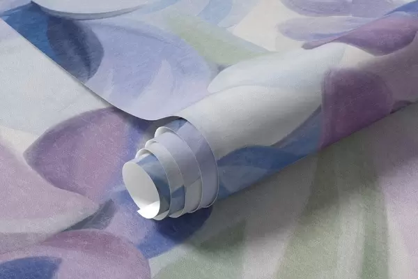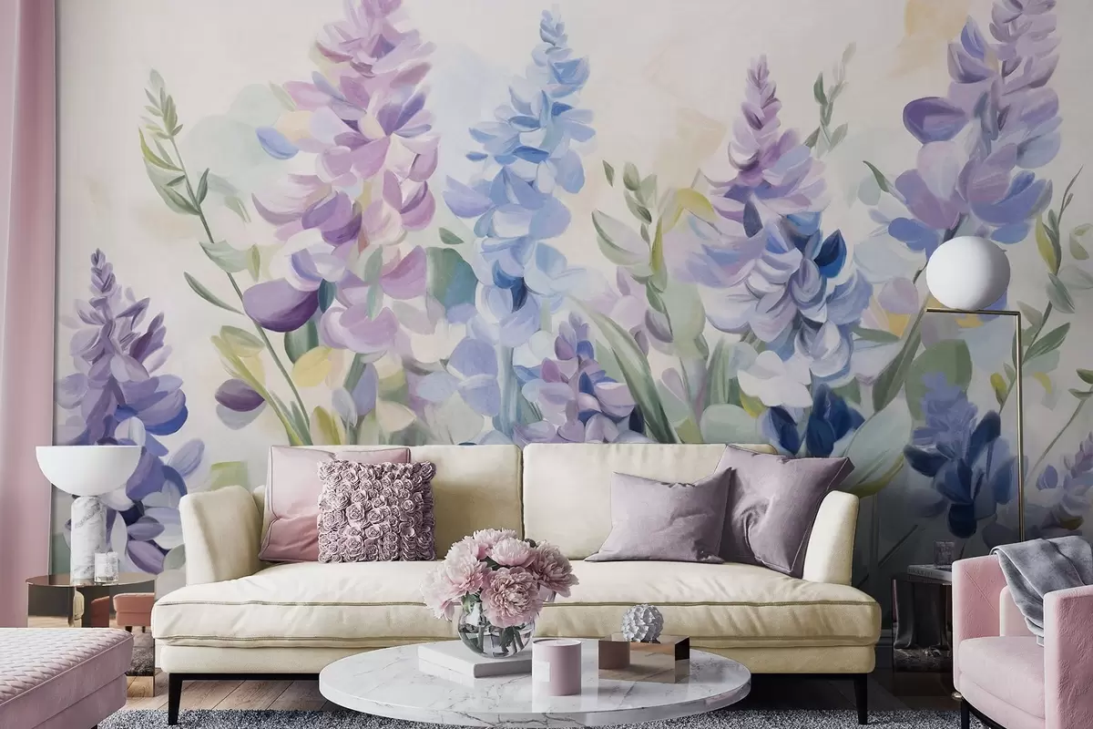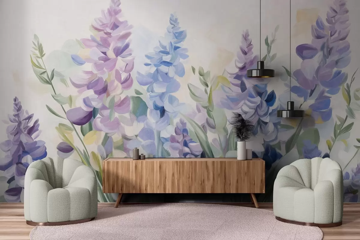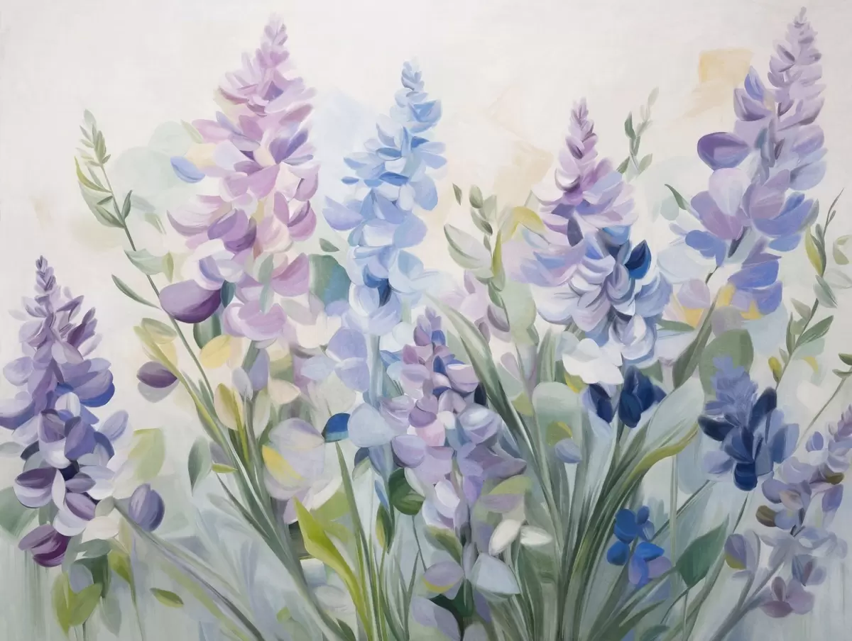 Wall murals Purple and blue textured flowers with blue leaves, light background, soft brush strokes, vibrant colors Nr. w09482