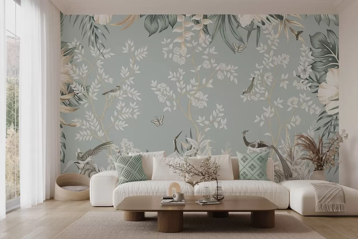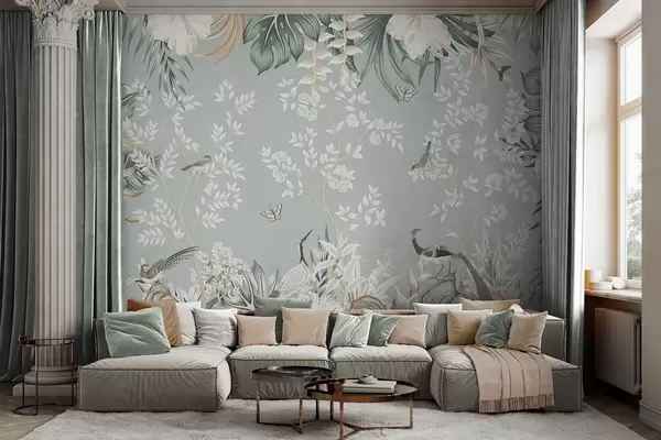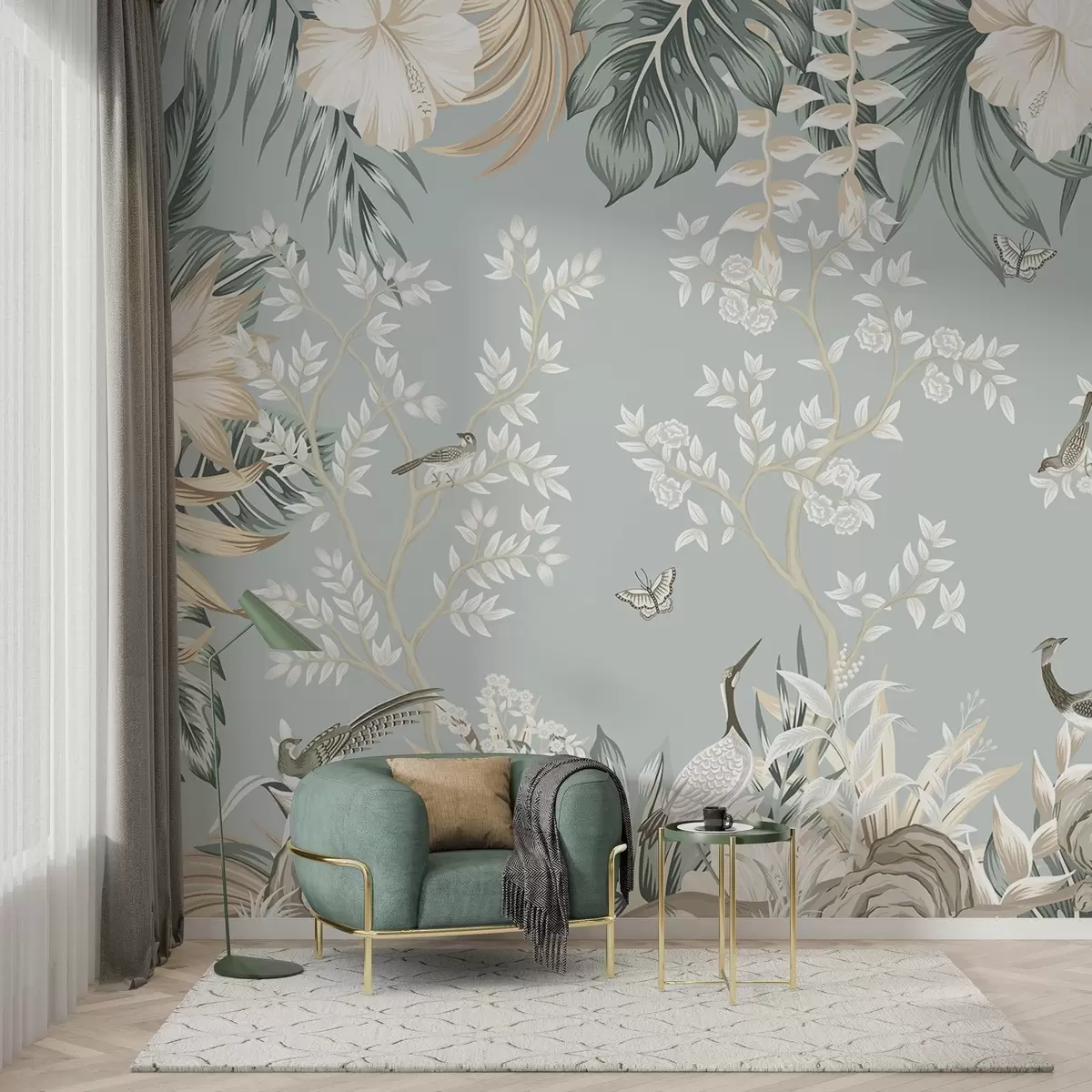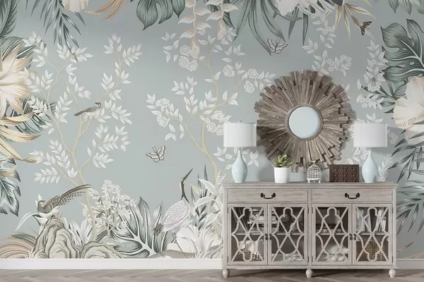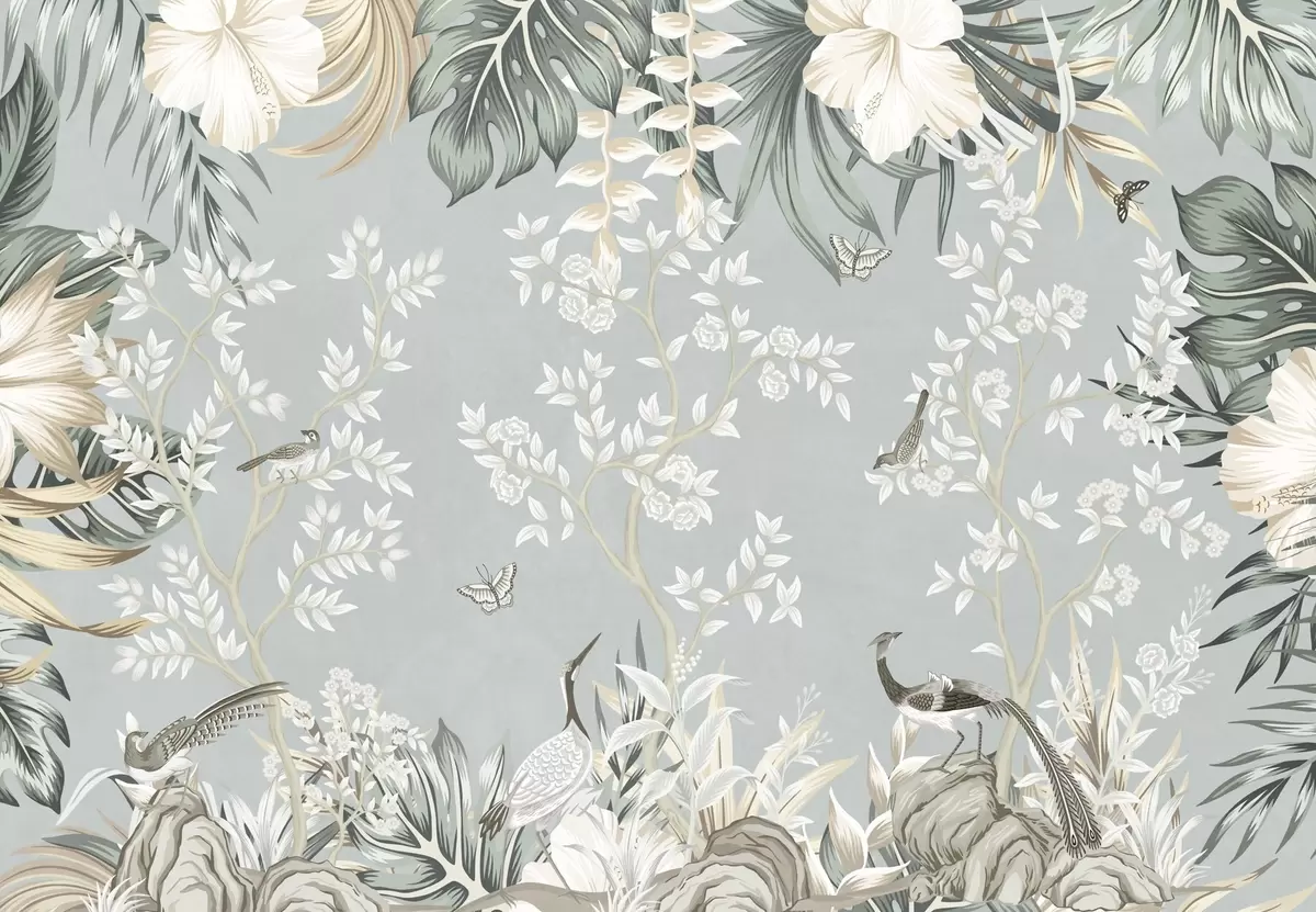 Wall murals Tropical textured pastel art with birds, butterflies, hibiscus flowers, palm leaves and trees in a light blue background Nr. w09528