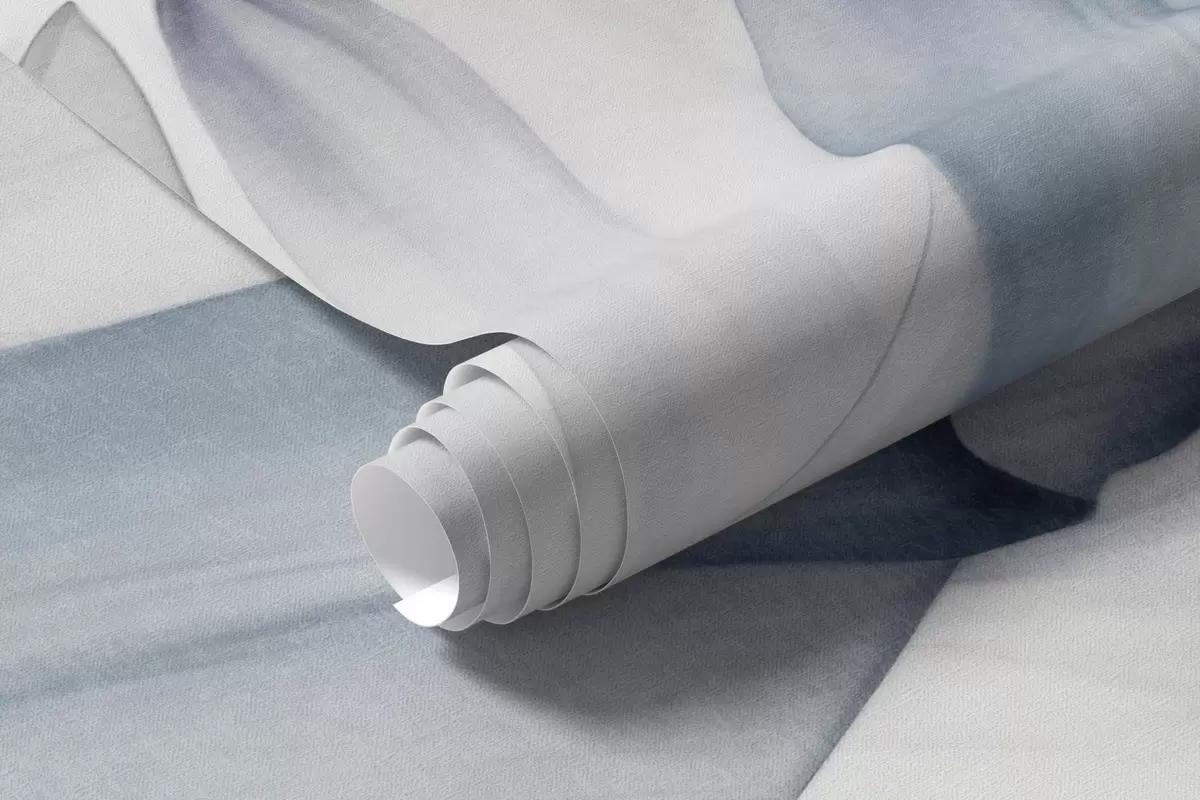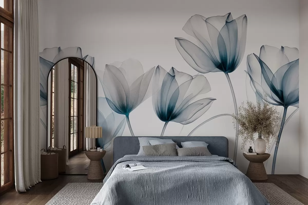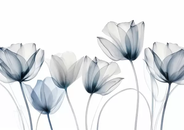 Wall murals Translucent blue and white tulip flowers with long stems, against light background, delicate and textured floral art Nr. w09538
