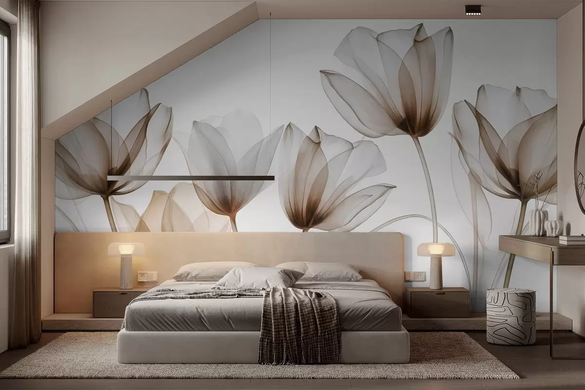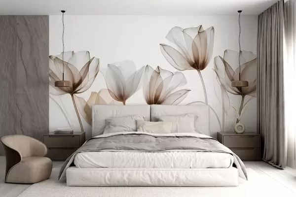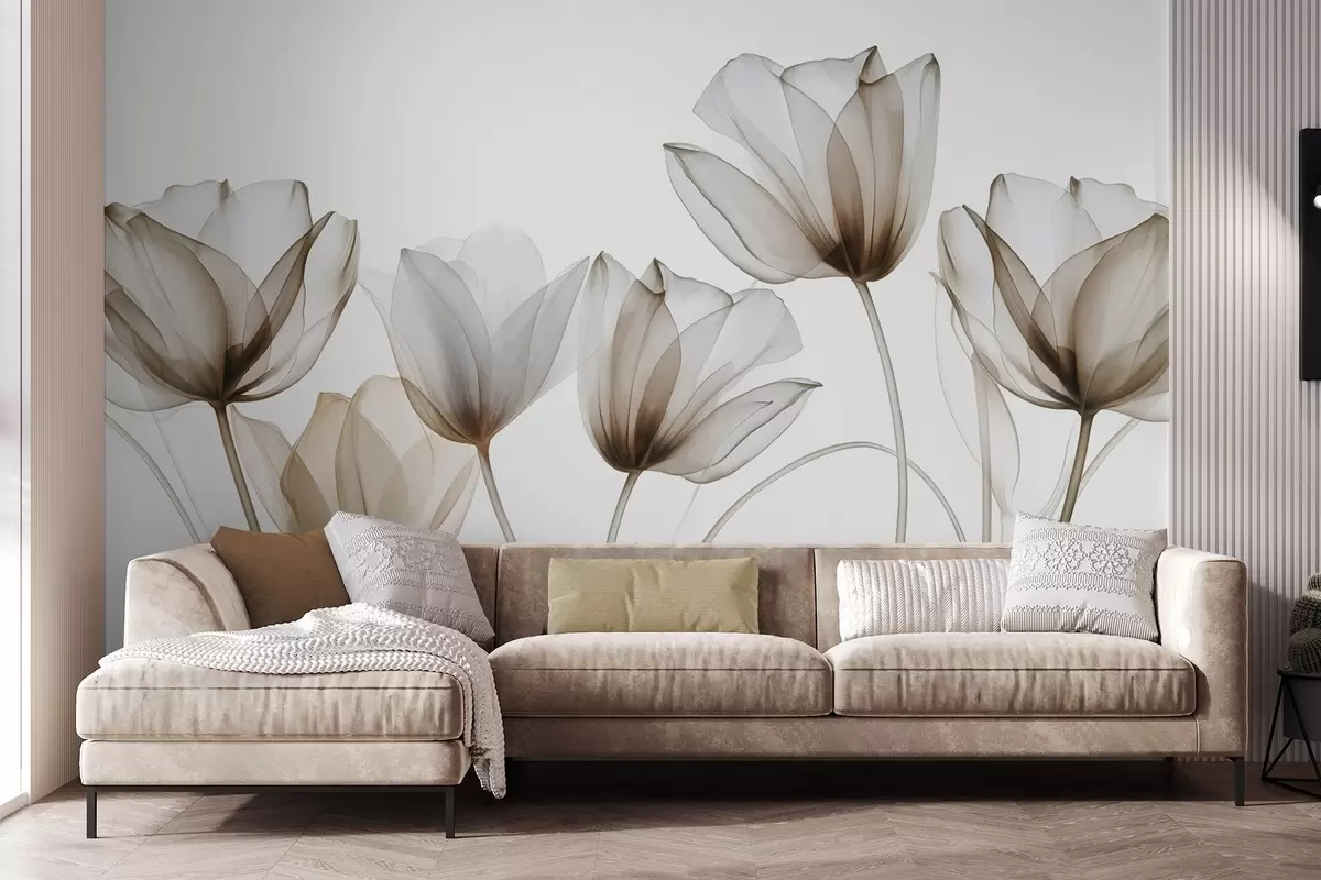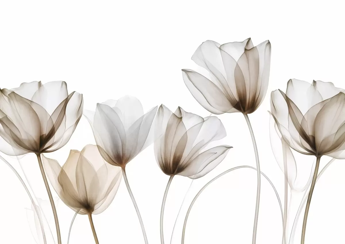 Wall murals Translucent brown and white tulip flowers with long stems, against light background, delicate and textured floral art Nr. w09538v1