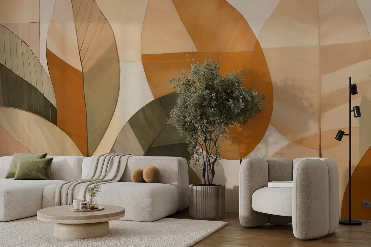 Wall murals Abstract large leaves in shades of orange, brown and green, textured, arranged against a light background Nr. w09539
