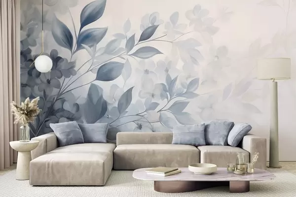 Wall murals Textured blue and white branch with flowers and leaves fading into a light background watercolor painting style Nr. w09543