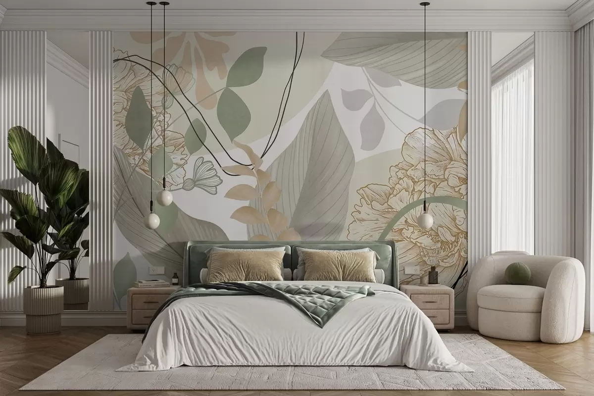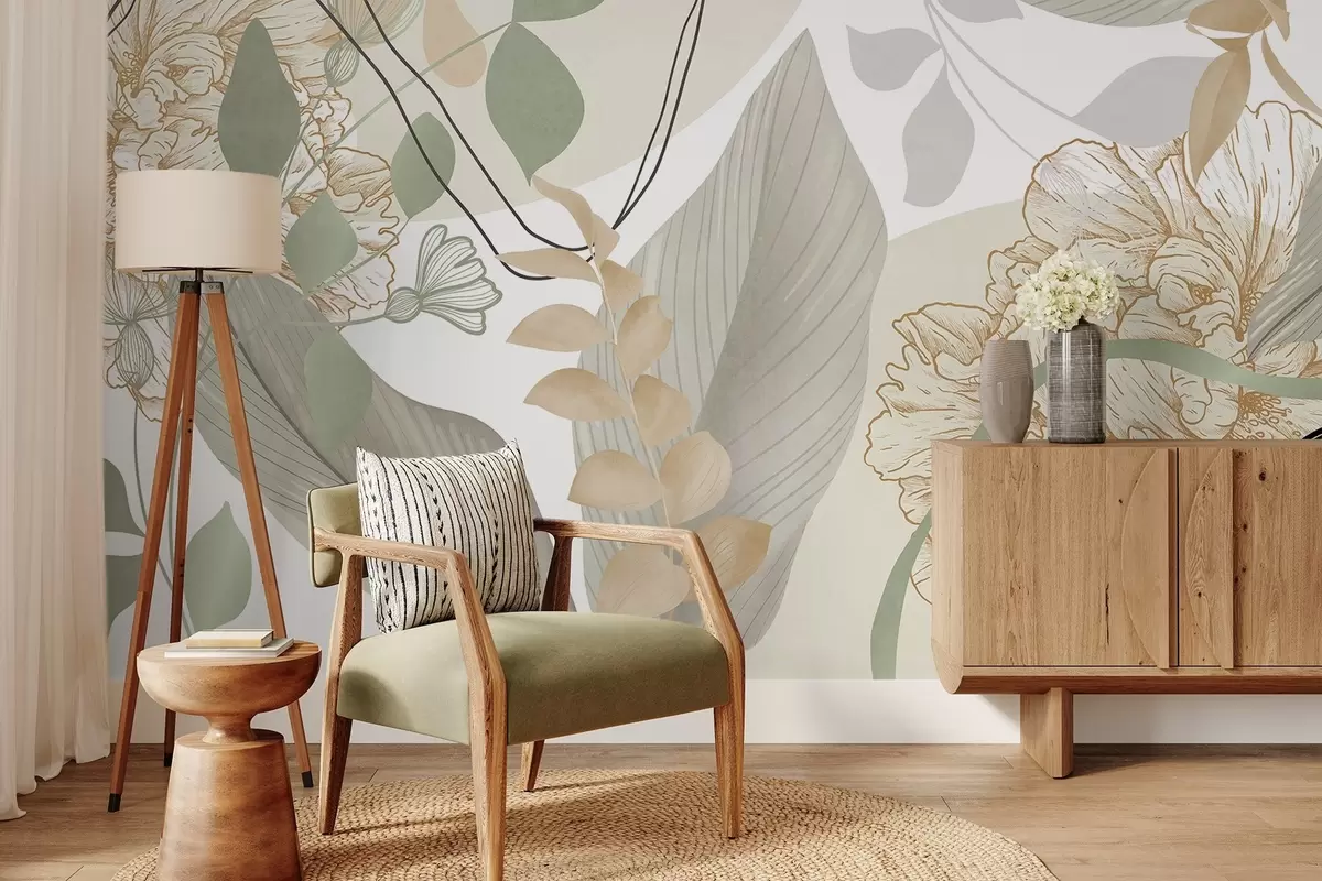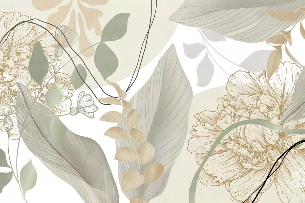 Wall murals Abstract floral print with large leaves in shades of muted green and yellow with thin black lines and white floral outlines Nr. w09544v2