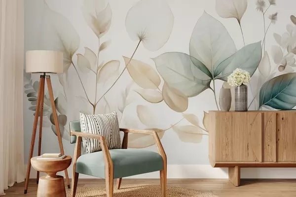 Wall murals Textured translucent leaves in muted tones of beige and teal, with delicate stems against a soft, light background Nr. w09583