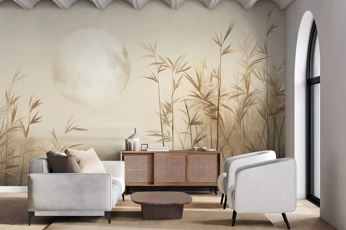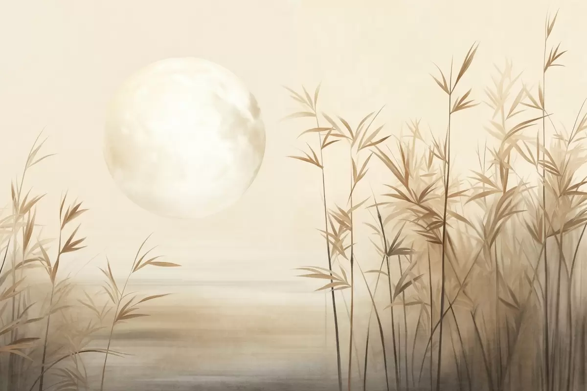 Wall murals Textured landscape with tall reeds, lake and pale moon in a hazy sky Nr. w09631
