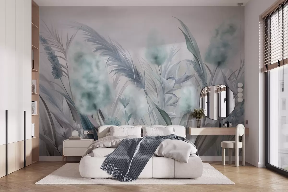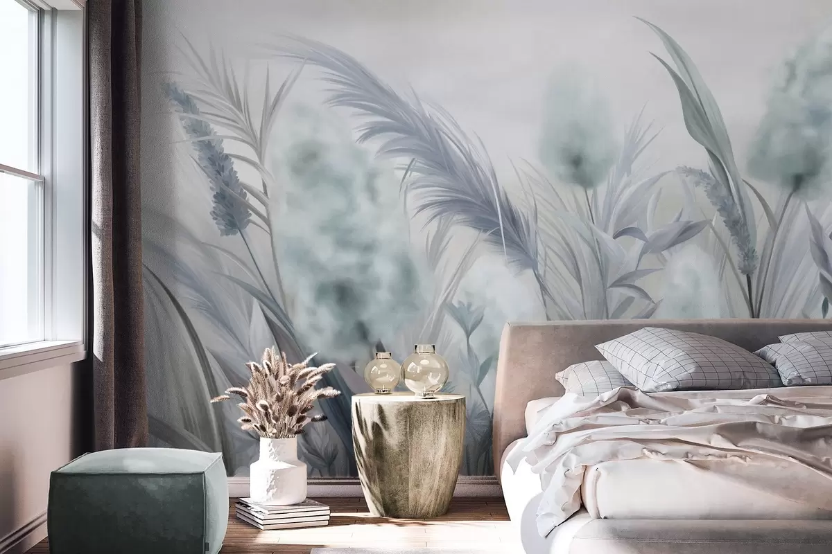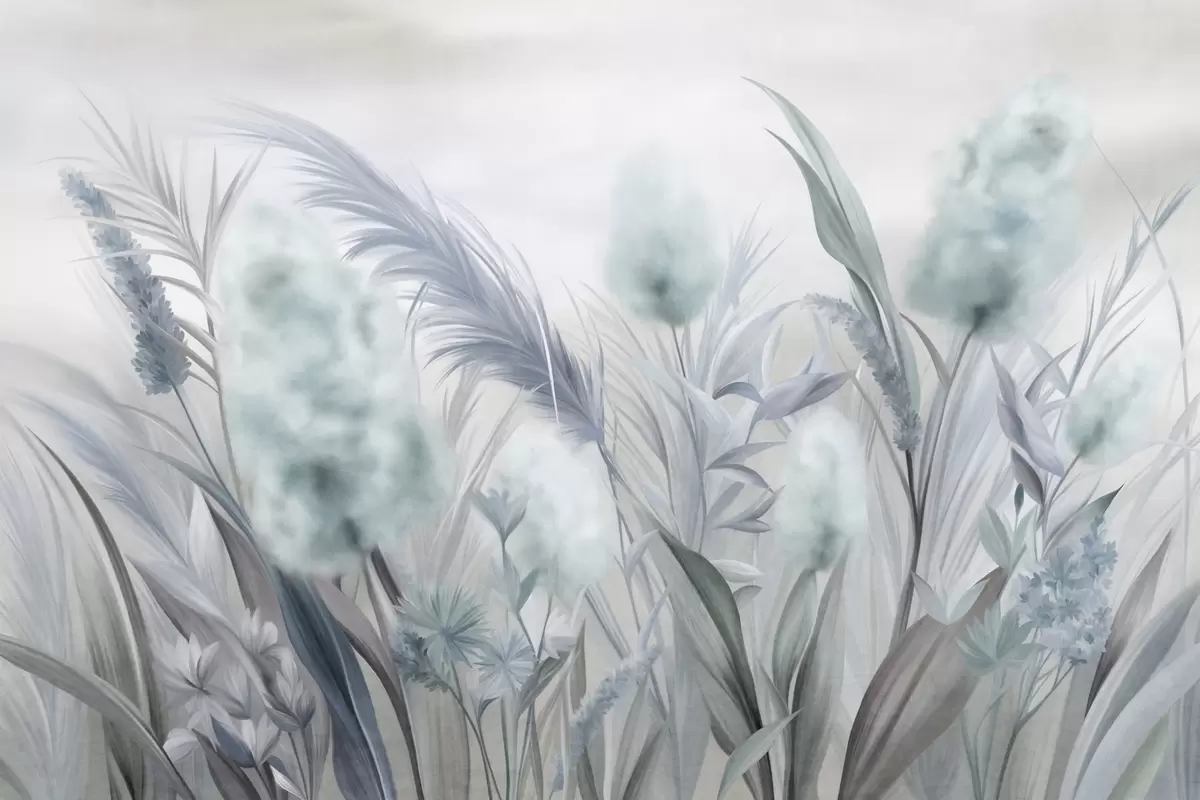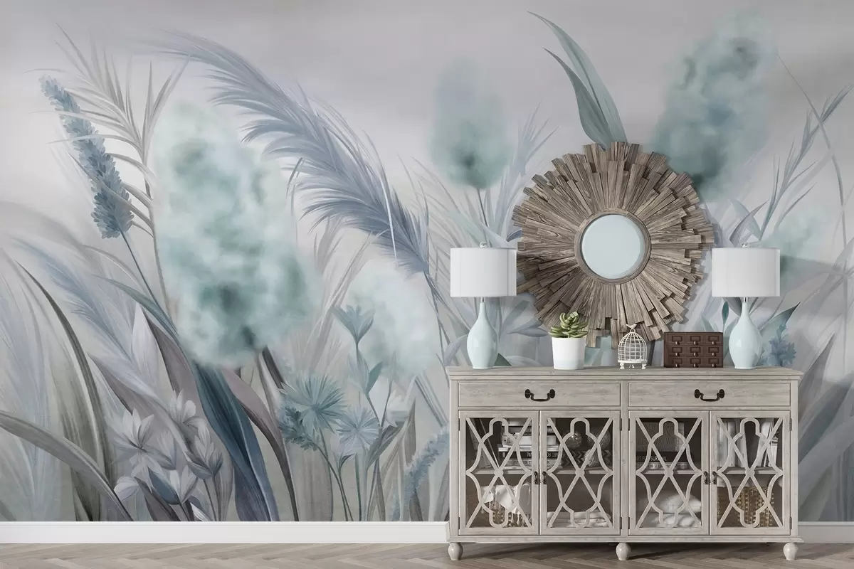 Wall murals Blue and gray pampas grass and other dried flowers with a soft, hazy sky in the background Nr. w09635v1