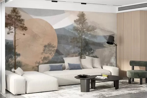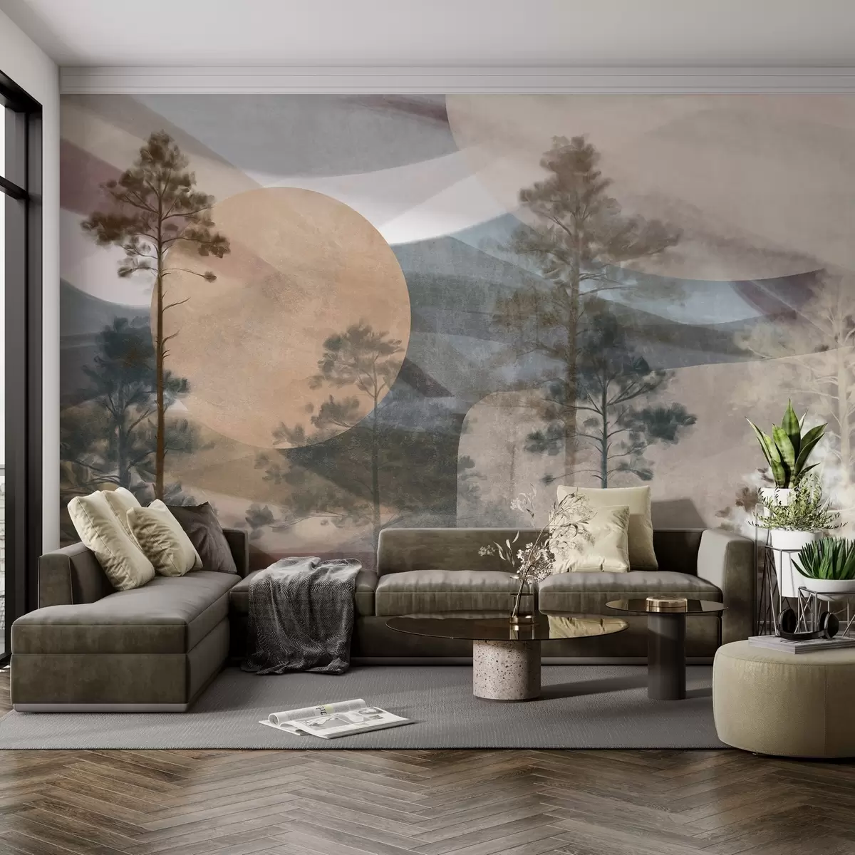 Wall murals Tall pine trees in a muted textured landscape with abstract circular shapes and layered mountains in earthy tones Nr. w09636