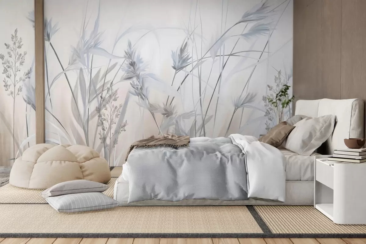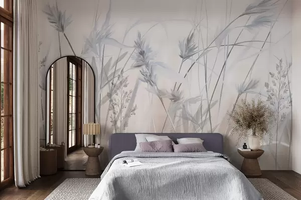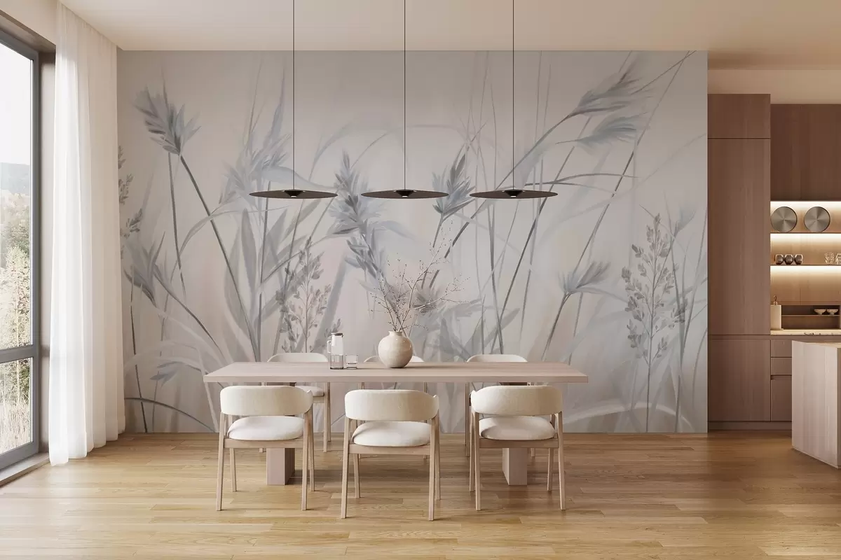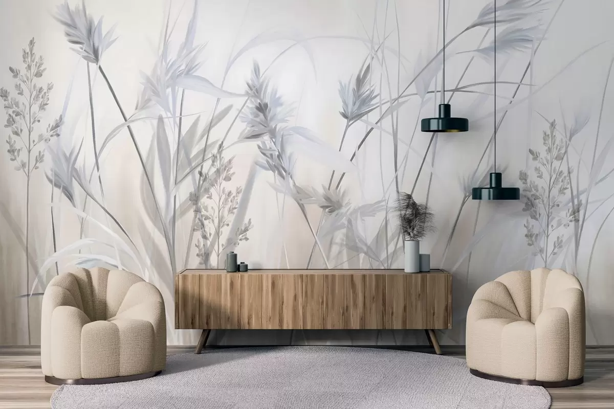 Wall murals Tall, dry grass stalks with feathery tops in muted tones, soft, hazy white and beige background Nr. w09652v1