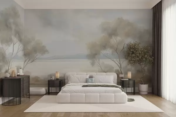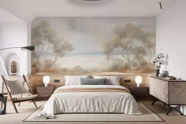 Wall murals A landscape textured painting style with trees under a cloudy sky Nr. w09753