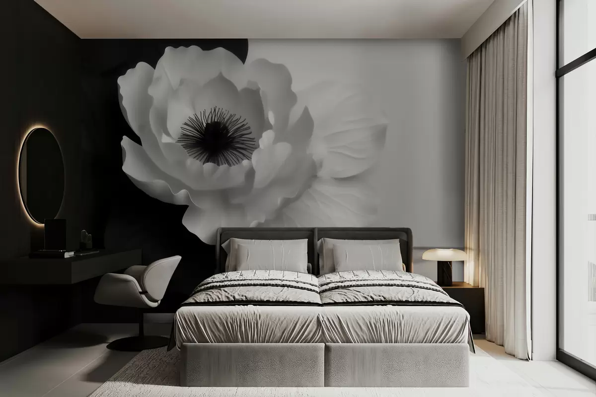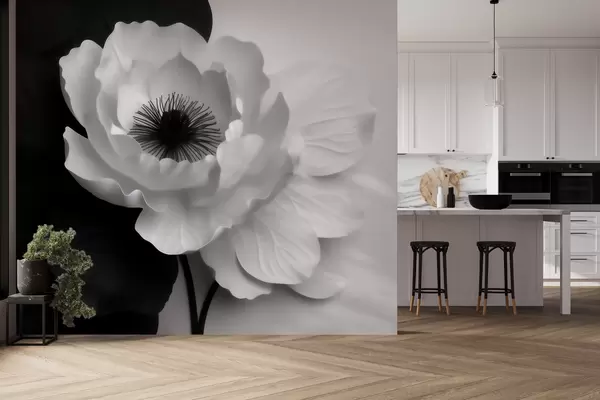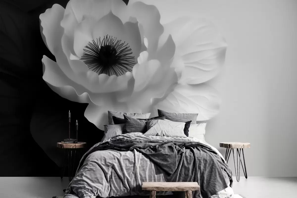 Wall murals A contrasting white flower with a dark center on a black-and-white background Nr. w09852