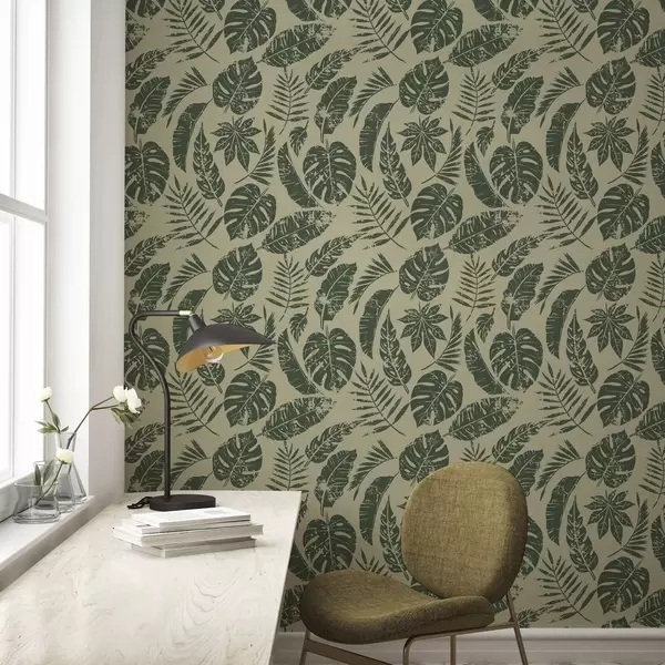 Wallpaper Tropical leaves in linocut style, green on yellow a00274