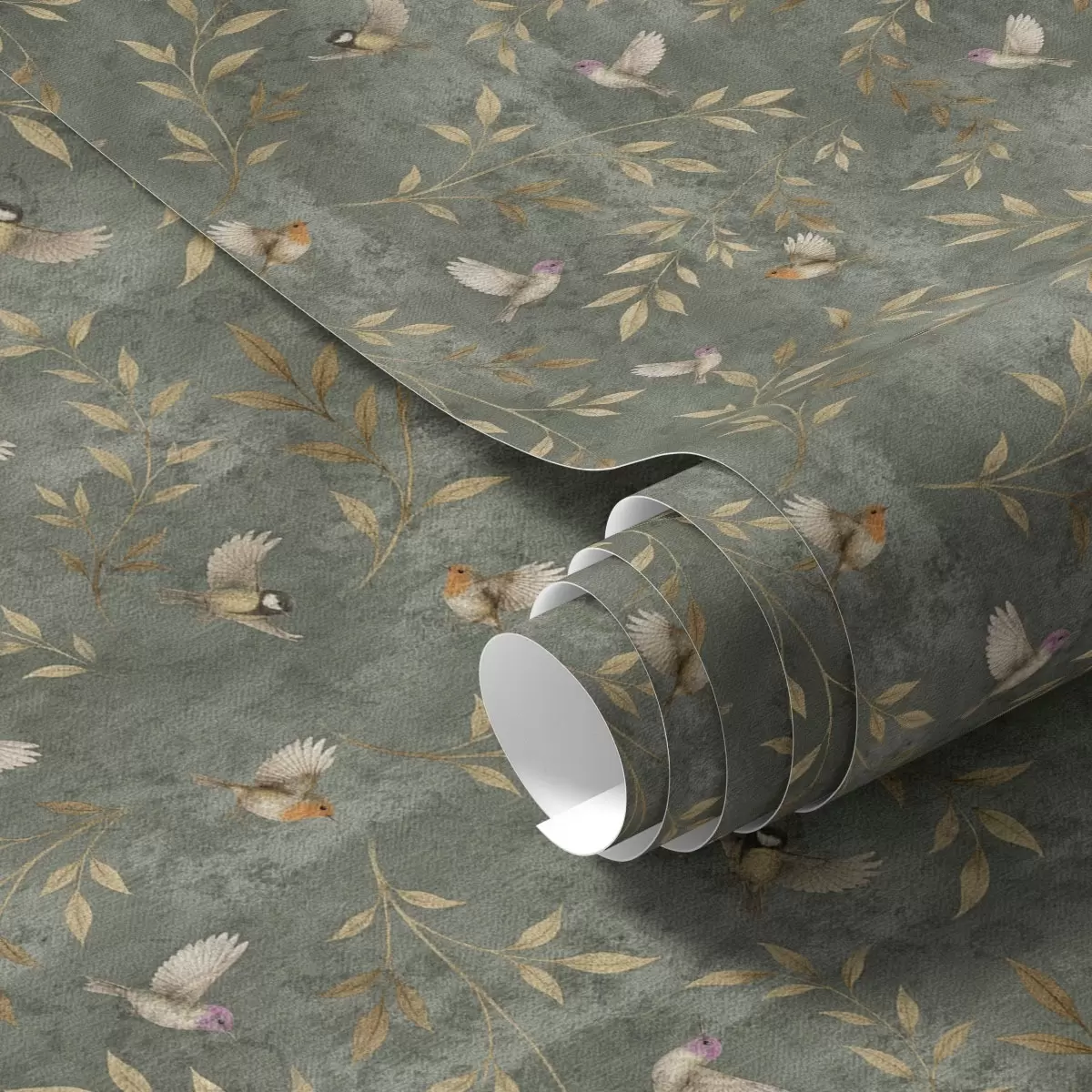 Wallpaper Birds in orange foliage on a deep green background a00591