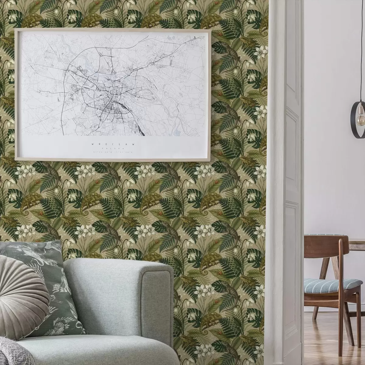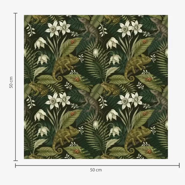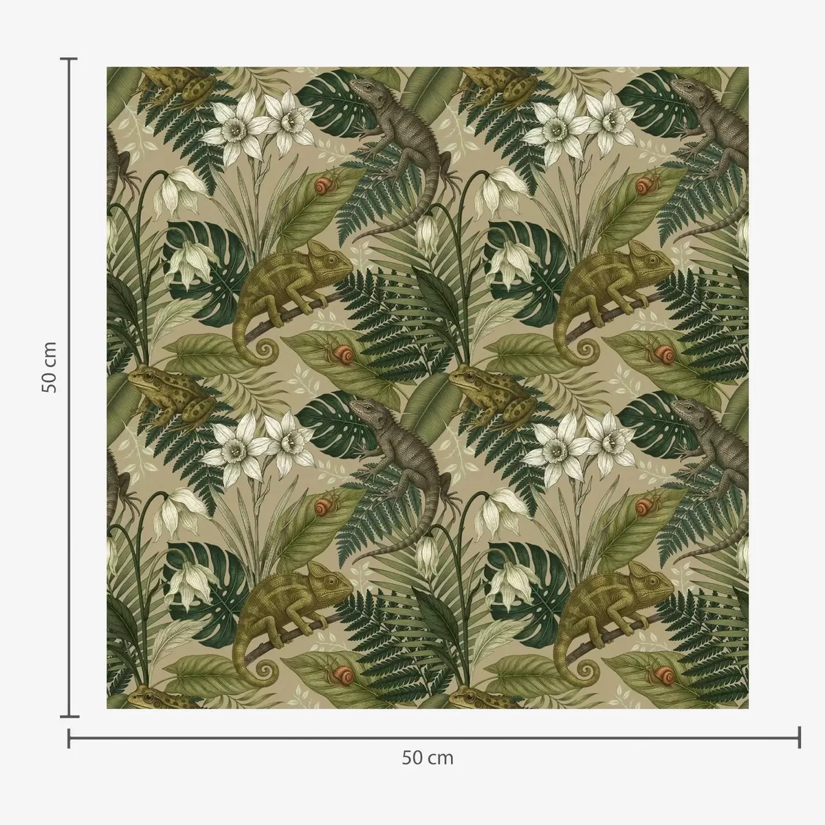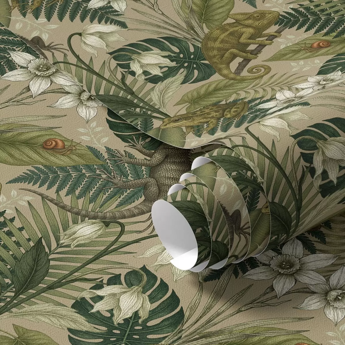Wallpapers Chameleons and tropical leaves, white flowers, beige ground Nr. a00608