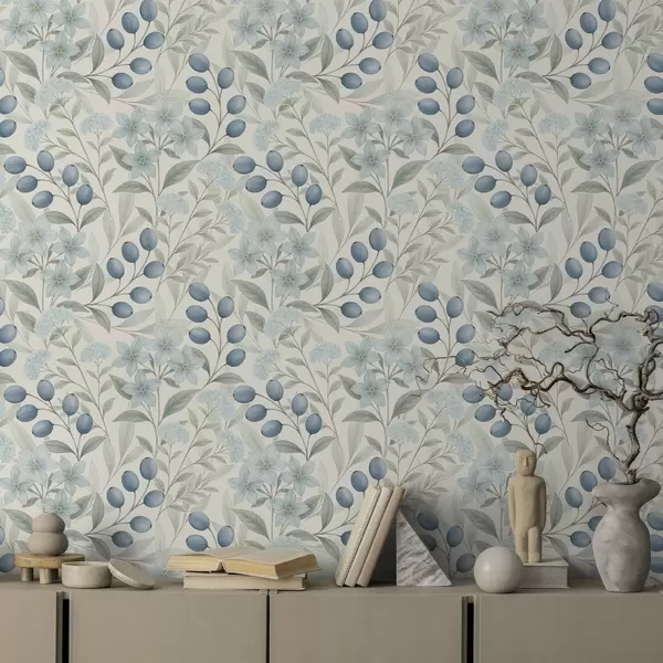 Wallpapers Blue berries and light flowers on ivory Nr. a00872
